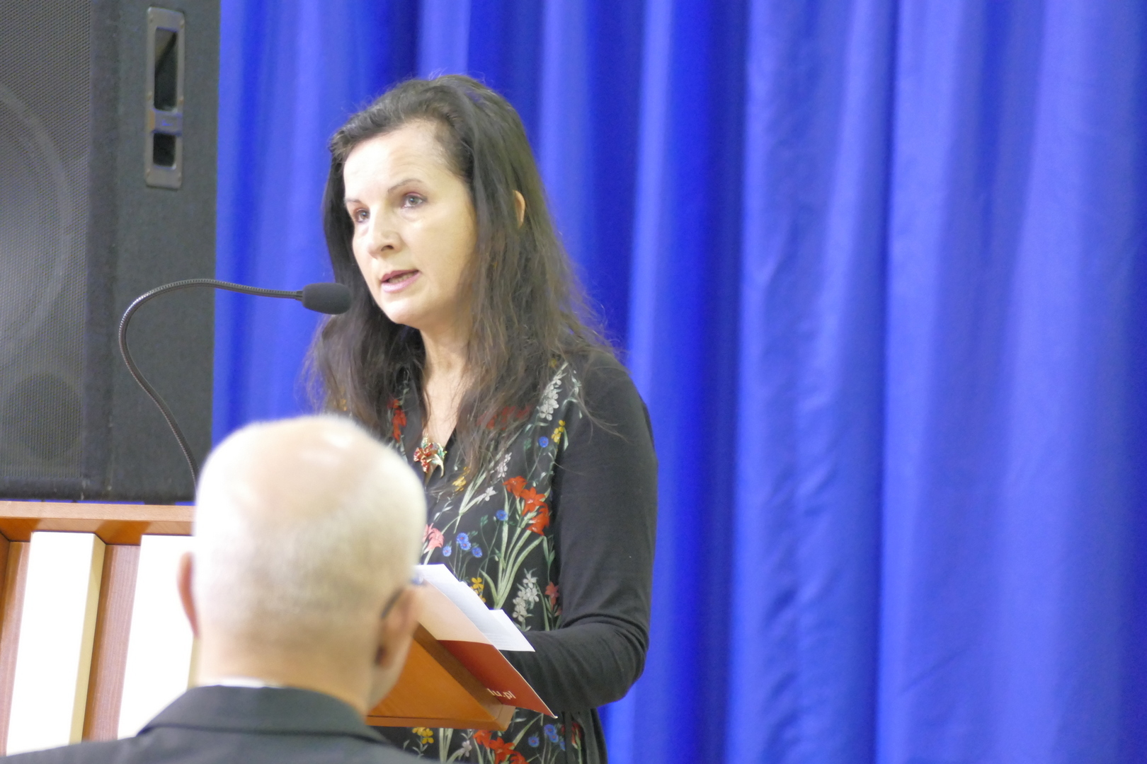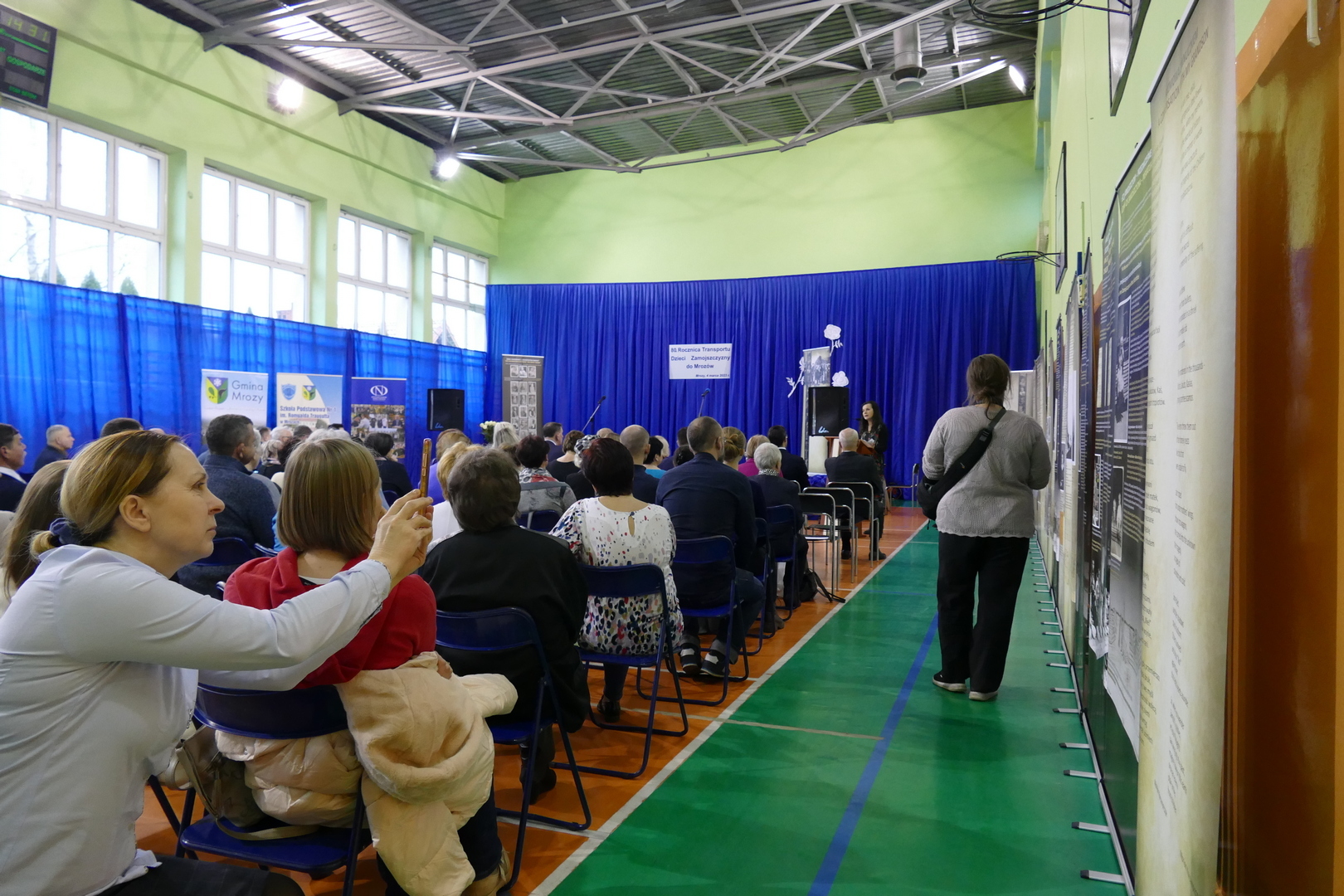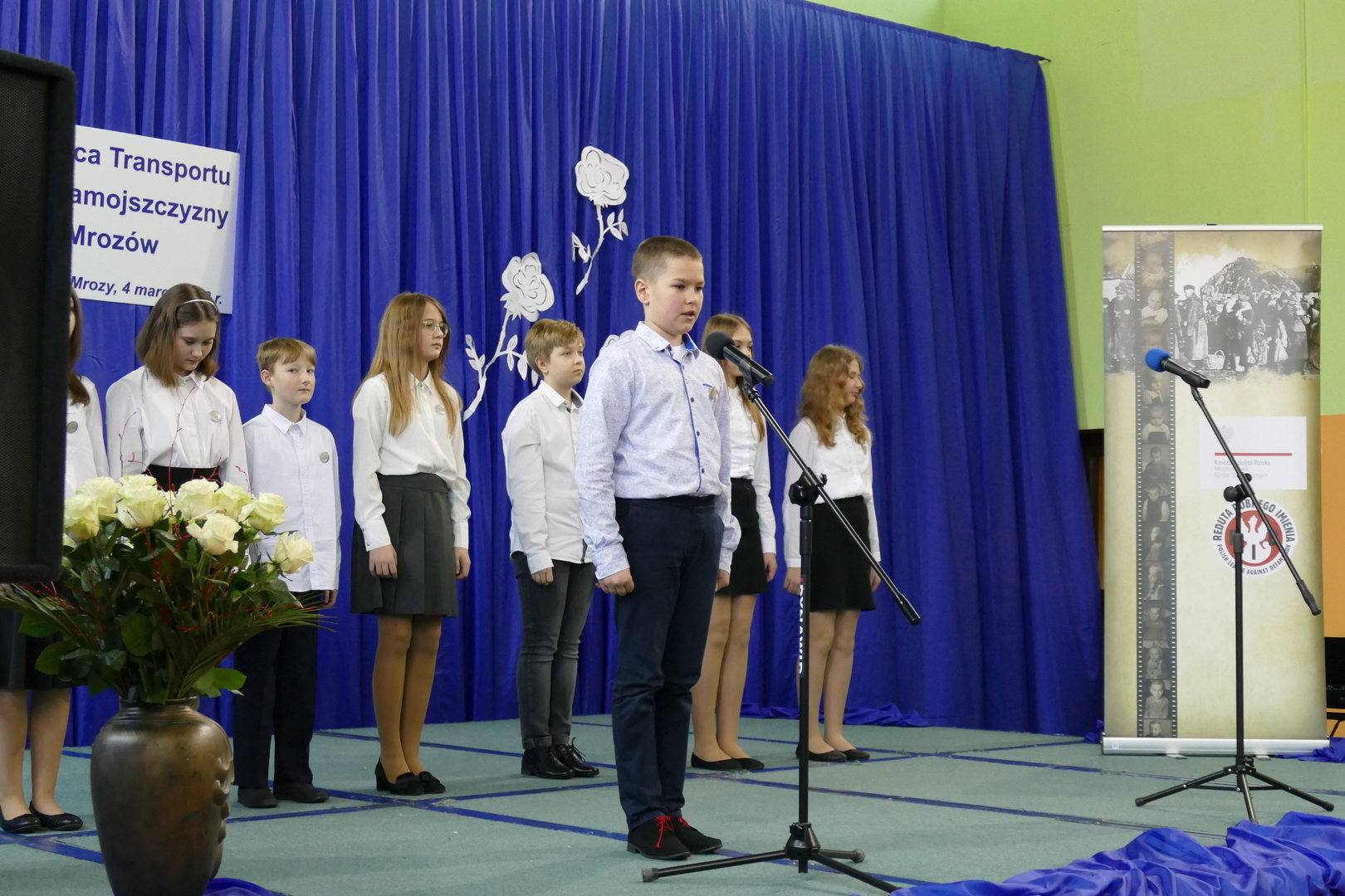W Szkole Podstawowej uroczystość hymnem państwowym rozpoczął Chór Miasta i Gminy Mrozy. Przybyłych gości przywitał Pan Dariusz Jaszczuk – Burmistrz Mrozów wraz z Panią Martą Prusińską – Dyrektor Szkoły Podstawowej w Mrozach. Następnie Pani dr Beata Kozaczyńska z Uniwersytetu Przyrodniczo-Humanistycznego w Siedlcach wygłosiła okolicznościowy referat, w którym przybliżyła historię wojennych losów dzieci polskich wysiedlonych z Zamojszczyzny w latach 1942-1943. Drugi referat na temat bohaterskiej postawy lokalnej społeczności Mrozów i okolicznych gmin w obronie Dzieci Zamojszczyzny przedstawiła Pani Ewa Grabarczyk. Wzruszającym momentem tej części uroczystości były wspomnienia Pani Marii Popek - Dziecka Zamojszczyzny, która opowiedziała o swoich przeżyciach związanych z dramatem wysiedlenia oraz doświadczoną pomocą. Nie zabrakło także wystąpień zaproszonych gości: Pana Czesława Mroczka – Posła na Sejm RP, Wojciecha Labudy – Pełnomocnika Prezesa Rady Ministrów ds. ochrony miejsc pamięci, Aurelii Michałowskiej - Mazowieckiej Kurator Oświaty, Pana Bartosza Popka – Wójta Gminy Grabowiec, Pana Arkadiusza Czyżewskiego - Burmistrza Kałuszyna.